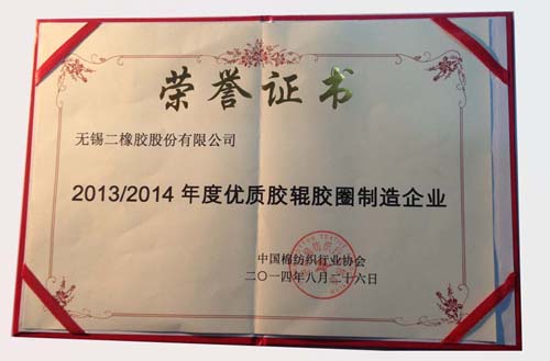 本公司通過了中國棉紡織行業(yè)協(xié)會(huì)對(duì)參與企業(yè)進(jìn)行的調(diào)查問卷、實(shí)地調(diào)研、網(wǎng)站調(diào)查、推選結(jié)果網(wǎng)站公示等方式,最終獲得了膠輥膠圈生產(chǎn)企業(yè)領(lǐng)域里面唯一一個(gè)獲得此榮譽(yù)稱號(hào)的公司。
